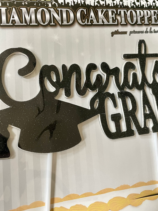 Congrats Grad Black (No Mess) Diamond Glitter Graduation Party Cake Topper