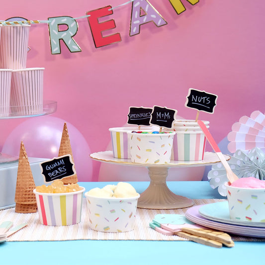 Dive into a world of whimsy as you sprinkle excitement into every scoop with our creatively curated ice cream-themed party essentials. From vibrant tableware to playful decorations, each piece is designed to capture the essence of summer joy and make your gathering feel like a delightful day at the ice cream parlor.