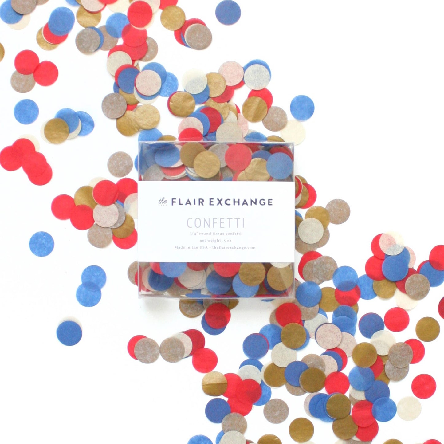 - Confetti is made and packaged by The Flair Exchange in the USA