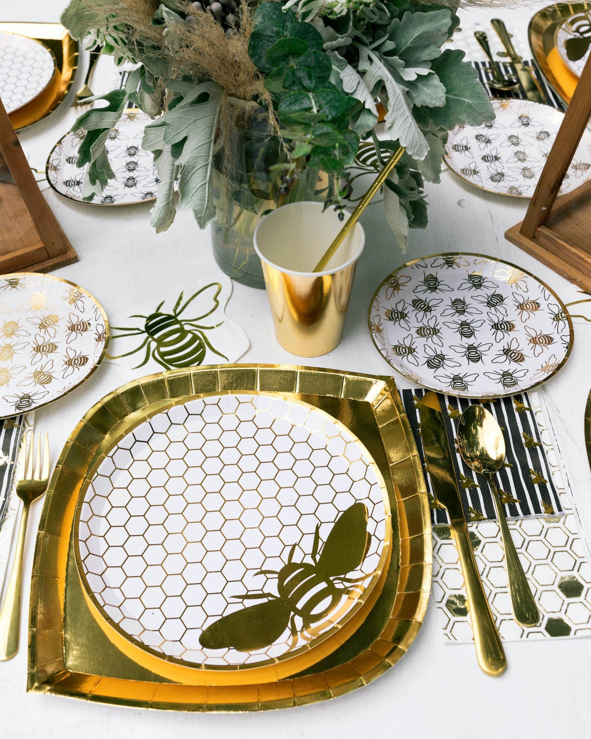 Add a touch of buzz-worthy elegance to your summer celebrations with our Bee Honeycomb Gold Dinner Plates.