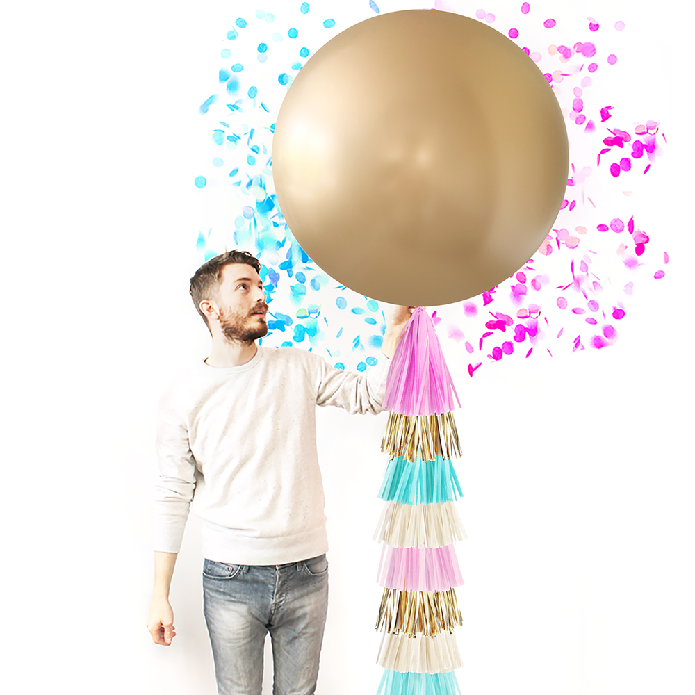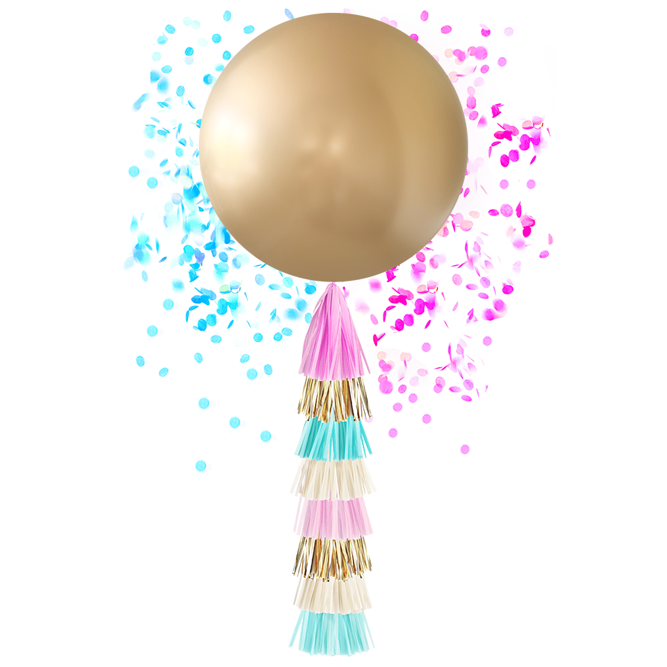 - Includes 16 DIY Tassels, Jumbo 24" Opaque Gold Latex Balllon, Pack of Pink Confetti, Pack of Blue Confetti, String, Instructions