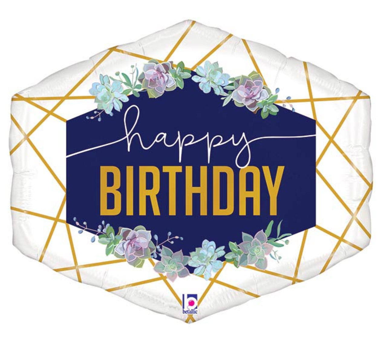 - 30" packaged geo shape with a navy center and succulents and the message "Happy Birthday"